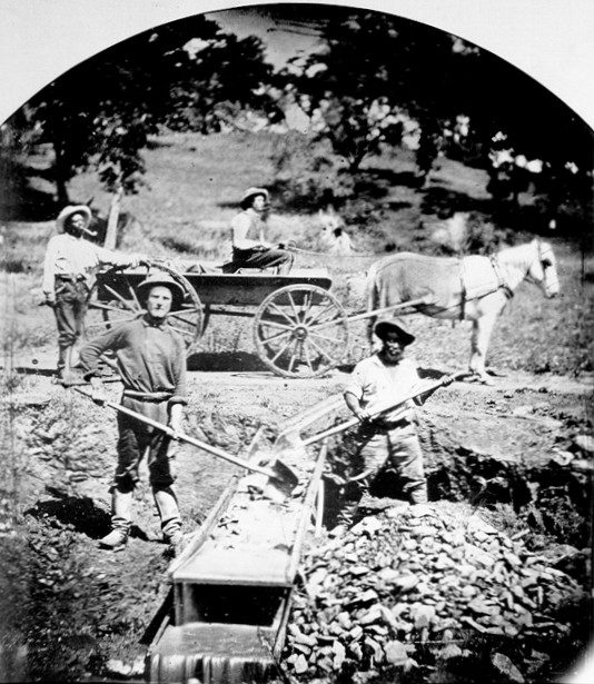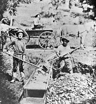 When miners first made the trek to the "New Diggins" camp, they extracted the gold by panning, or by sluicing, which allowed small teams to wash the gold-bearing gravels and concentrate the flakes and nuggets. Soon more expensive operations moved in, such as hydraulic mining of the gravels in quarries using high-pressure water houses, and the digging of drift mines (horizontal tunnels) and vertical shafts to reach ancient gravels that were buried deep beneath the ground. From the middle 1850s through the 1870s, the placers proved to be extremely rich. For example, one 20-acre placer claim yielded half of the $10 million in gold produced by 1910 from the Coon Hollow district alone; and the Texas Hill and White Rock diggings by 1910 had produced $5 million each (mostly from the Deep Blue Lead Tertiary channel). The photo at the upper left, from an old glass ambrotype (similar to a daguerrotype), shows miners in 1852 using a "long Tom" to sluice gravels at Spanish Flat, a mining camp in El Dorado County just a few miles north of Placerville.