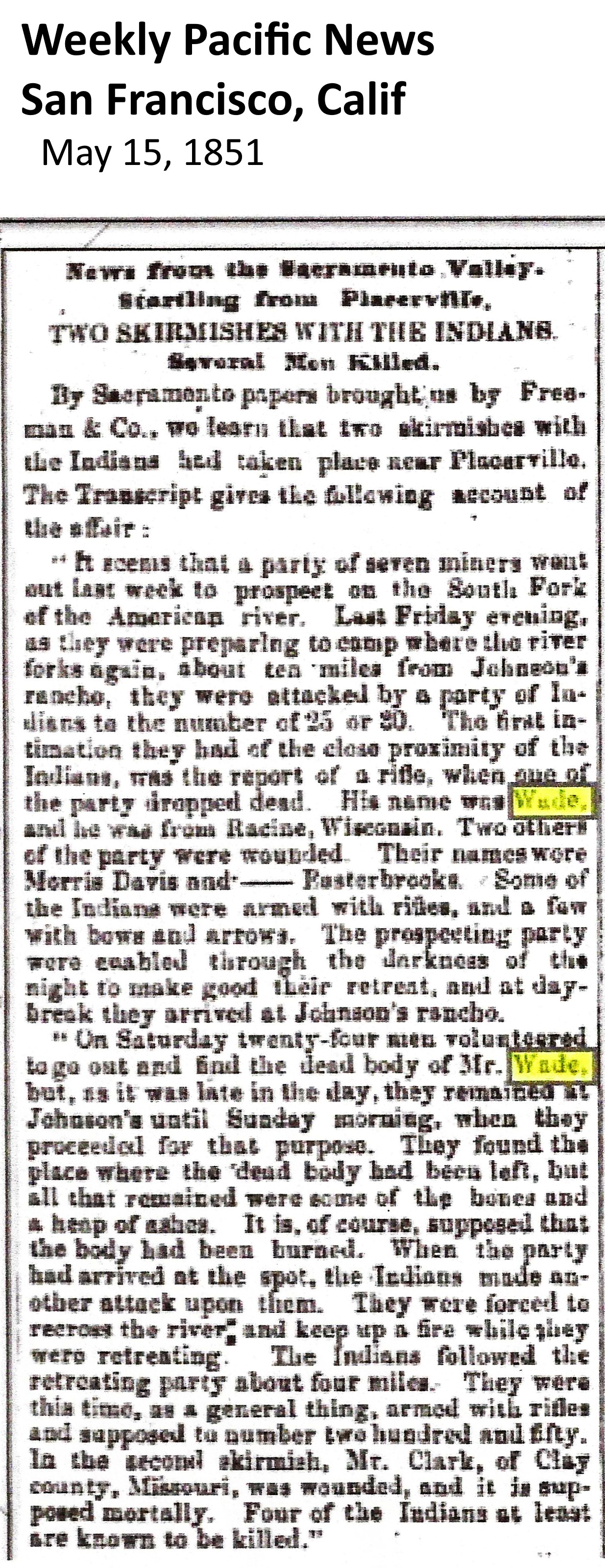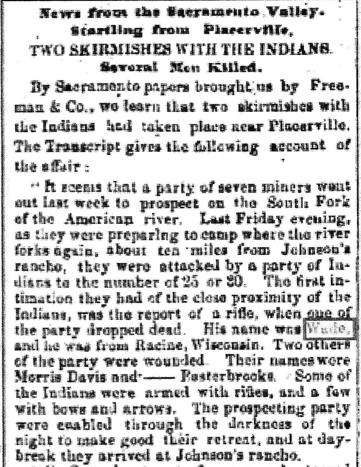 Oakland Tribune, Aug. 17, 1947. Placerville War An Indian War of burlesque description took place in the region above Placerville in the early 50's of the last century. Some letters from John W. Winkley's* friend, Mrs. Ivy Miller* of East Oakland, who was born and raised near Placerville, brought this ancient story to his mind. "In May, 1851," says Winkley, "a group of miners---[Thomas?] Davidson, Morris, [William] Toombs, [Samuel] Esterbrook, Kerkuf and [John B.] Wade---went on a prospecting trip from Wisconsin Bar on the Consumnes River to the Middle Fork of that river and halted for the night. Here in the darkness they were attacked by a band of Indians and Wade was killed. The other men fled, and got across the river on some fallen logs, where they hid in the brush till morning and then escaped across country to Johnson's Ranch, near Pleasant Valley. The news of the attack quickly spread and the authorities proceeded to raise an army of about 200 men who played around in the mountains for sometime, chasing a few Indians through the wilderness. They had a good time, but it cost the national government a lot of money." *Rev. John W. Winkler (1882-1970) was a pastor of the Hayward Methodist Church in Alameda County, a historian with the Contra Costa Historical Society (CCHS), and the author of several historical newspaper columns published in the Oakland Tribune. He is probably most remembered as the author of Methodist Pioneers of California (1947), but he also assembled a large collection for the CCHS of letters, reminicenses and interviews of people he met and corresponded with, whose parents and grandparents took part in the California Gold Rush.. Placerville Mountain Democrat, October 5, 1977, p. 39. House tour features old, new favorites TOOMBS RANCH HOUSE Crossing the plains at any time of the year was difficult, but Englishman William Toombs did it in the Fall and Winter of 1849 arriving in the spring of 1850. Toombs bought the former Wooster ranch from Alfred Briggs in 1866, later adding his own land. One of his mines was the Thistle PM [Placer Mine] located on a tributary of the Tertiary channel called Blue Lead. The couple had nine children, four of whom were still living when death came to the parents within days of each other. TOOMBS SPANISH HOUSE There is only one Spanish house in western El Dorado county and it was built in 1929 by William S. Toombs [actually, it was built by Frank Toombs, son of William L. Toombs]. The light fixtures and hand hewn beams, wood doors and wrought iron were imported from Spain. Clay tiles on the roof were handmade and house features custom built cabinets. The house is in the southern portion of William Toombs original ranch of 187 acres. Toombs also owned 200 adjacent acres of mineral ground which later mostly farmed.